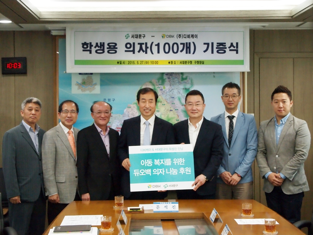(주)디비케이(대표이사 정관영)가 문석진 서대문구청장, (주)디비케이 오준성 부사장 등이 참석한 가운데 5월 27일 서대문구청에서 기증식을 진행했다. 금일 기증된 의자는 서대문구 내 만 12세 이하 아동을 지원하는 통합형 복지 서비스 ‘드림스타트’의 일환으로 100명의 아동에게 제공될 예정이다.