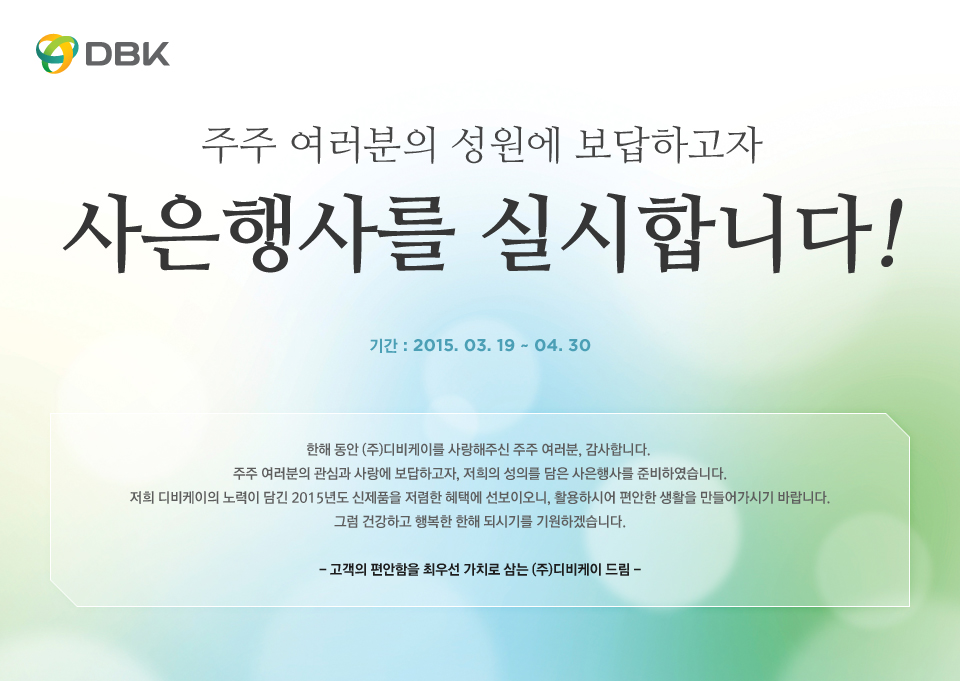 디비케이가 주주를 대상으로 자사 제품을 혜택가에 판매하는 ‘2015 주주 사은행사’를 진행한다. 이번 행사는 3월 19일부터 4월 30일까지 디비케이 온라인몰 듀오백스토어(www.duoback.co.kr)에서 시행하며, 2014년 12월 31일자 주주 명부에 등재되어 있는 모든 주주가 참여할 수 있다.