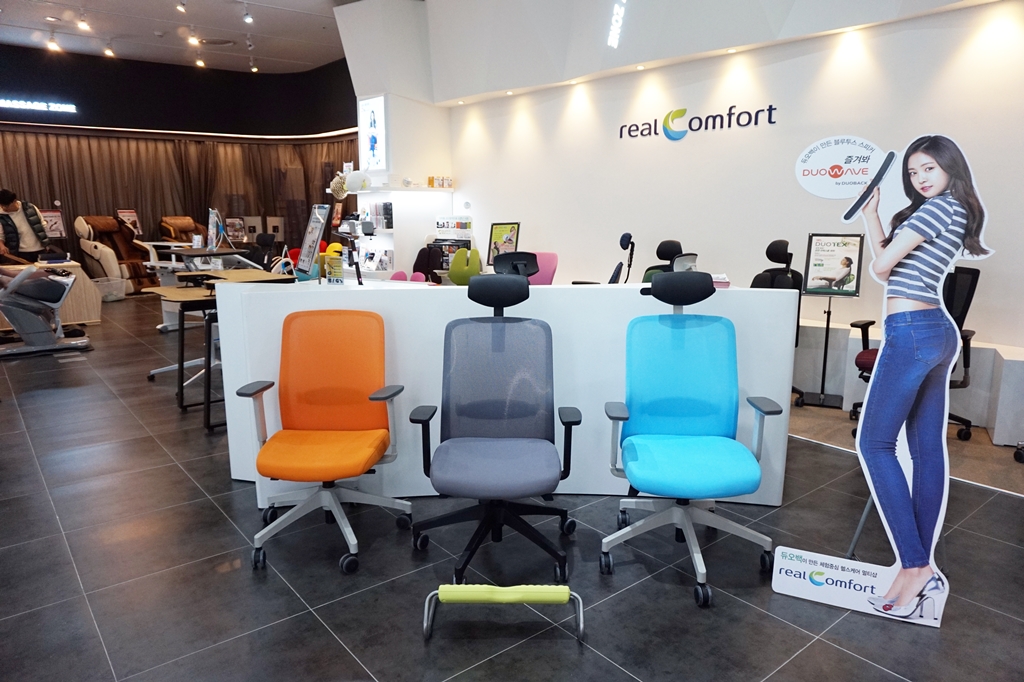 리얼컴포트 롯데월드몰점은 국내 브랜드뿐만 아니라 해외 브랜드의 상품도 한 자리에서 비교 체험해볼 수 있는 공간으로 구성했다. 특히 스터디존에는 최근 관심이 높아지고 있는 높이조절 책상 상품군을 강화했다. 새로 입점한 미국 사무가구 브랜드 ‘휴먼스케일’의 높이조절 책상은 전원을 연결하지 않고 사람이 손쉽게 높이를 조절할 수 있는 책상이다. 책상의 높이가 조절되는 속도를 사용자가 조절할 수 있어 너무 뻑뻑하거나 급작스럽게 작동하지 않고 부드럽게 움직이도록 제어할 수 있다. 높이조절 책상 외에도 기존의 책상에 부착해 모니터의 위치, 높이, 각도를 조절할 수 있는 ‘모니터암’ 등의 소품도 함께 판매해 고객의 필요에 따라 선택할 수 있다.
