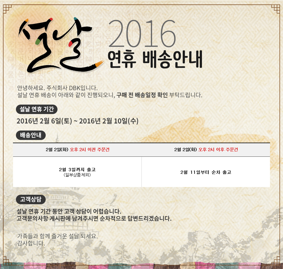 2016년 설날 연휴 배송안내